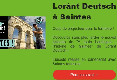 30 août 2025Lorànt Deutsch à SaintesLorànt Deutsch à Saintes : Coup de projecteur pour le territoire ! Découvrez sans plus tarder le nouvel épisode de "Á toute berzingue : l'histoire de Saintes" de Lorànt Deutsch !